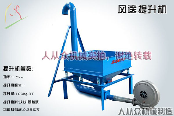 風力提升機由鼓風機、料斗、振動電機、輸送管道和其他裝置組成。電機作用于料斗,可以使物料勻速的下落,預防起拱和堵塞的現象。使用時先插電啟動振動電機和鼓風機,運轉穩定后向料斗內倒入物料,經過電機的振動,物料下落至運輸管道,遇到鼓風機吹來的強風,被吹至管道頂部隨著出料口均勻的以螺旋形式輸出,一氣呵成。